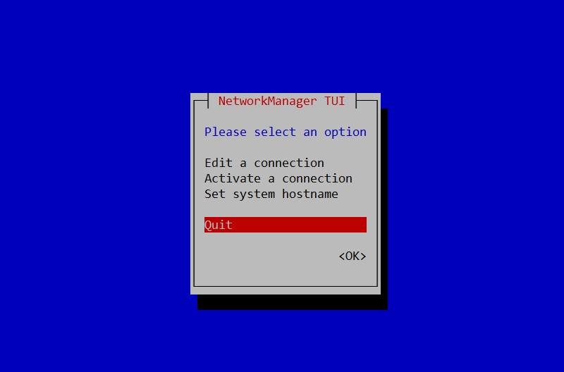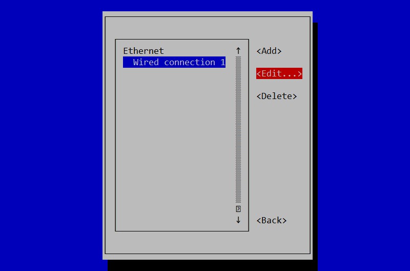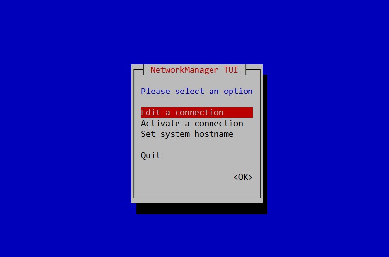 sudo nmtuiSe déplacer avec les flèches haut et bas pour sélectionner "Edit a connection", puis appuyer sur "Entrée" :