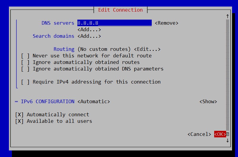 Avec la touche tabulation pour sélectionner "<Automatic>" en face de IPv4 ou IPv6 selon l'adresse IP que vous souhaitez configurer. Confirmer en appuyant sur "Entrée" :