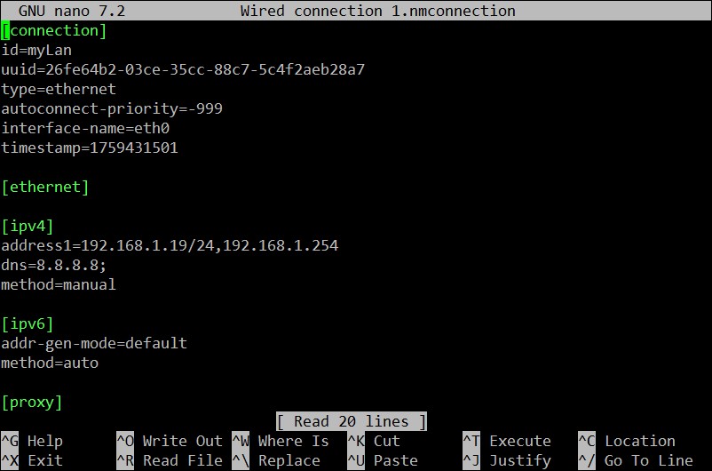 sudo nano /etc/NetworkManager/system-connections/Wired\ connection\ 1.nmconnection