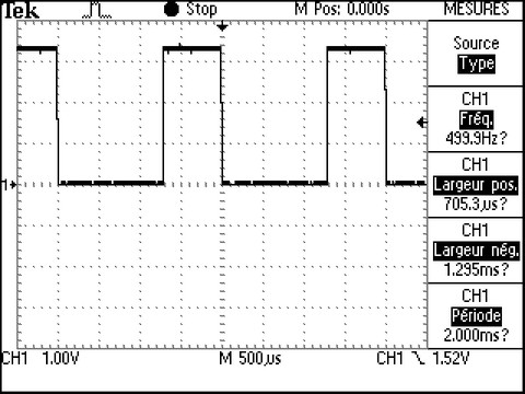 Relevé du signal obtenu (à un instant t, le rapport cyclique étant variable au cours de l'exécution du programme) à l'oscilloscope :