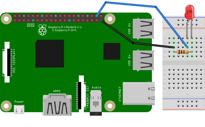 Dans cet exemple nous utiliserons une LED. Le câblage est identique aux précédents : la LED est connecté sur la GPIO 20.