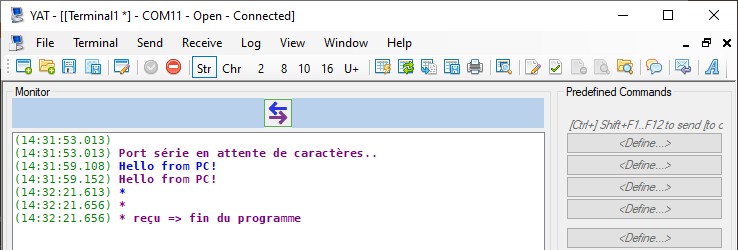 Pour observer le résultat coté PC, il faut utiliser un terminal (Putty, RealTerm, Yat,...).